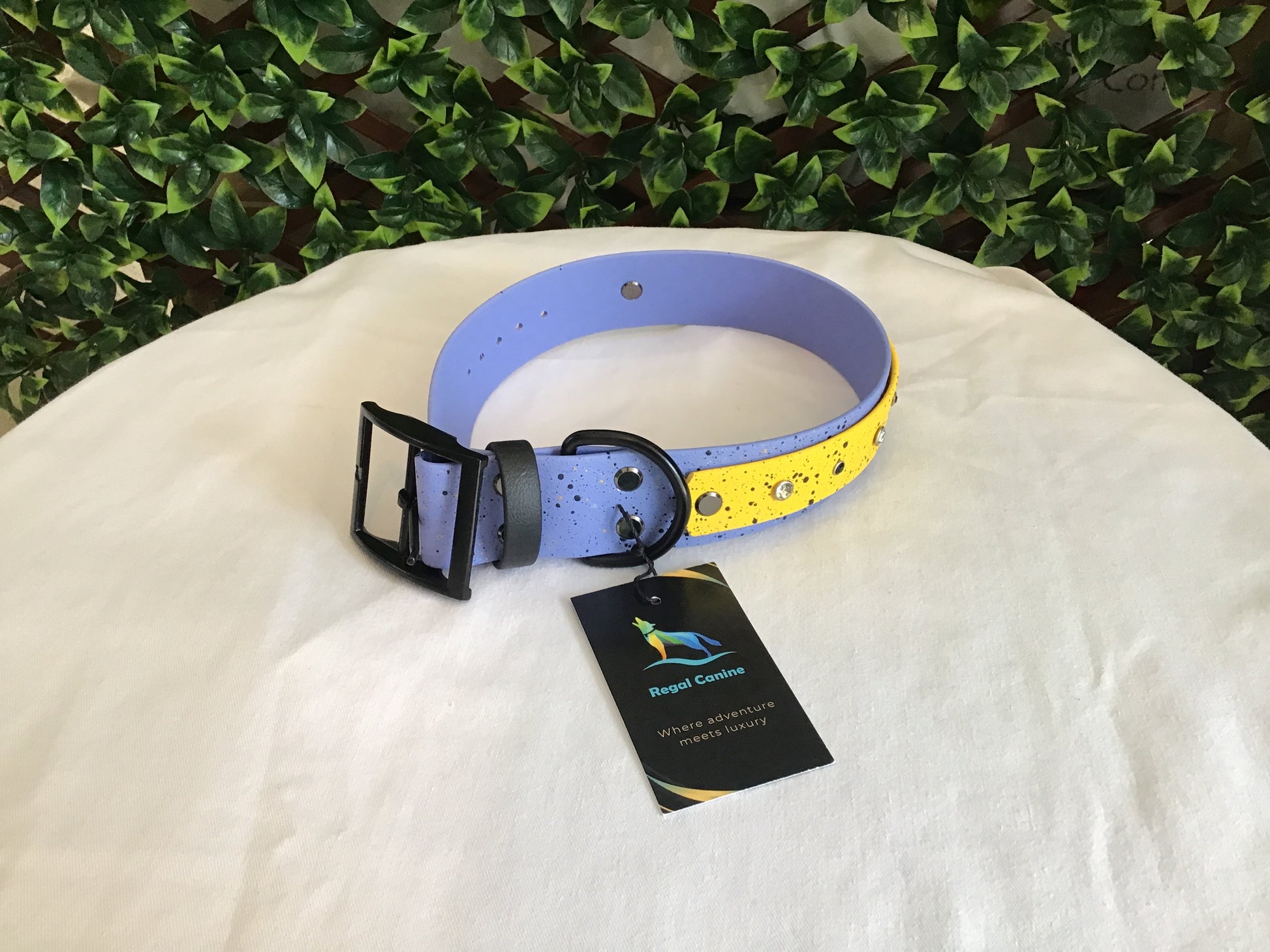 These colorful collars created by local vendor Regal Canine. They are Vegan, Leather Alternative Biothane. Very durable, waterproof, easy to clean and some even glow in the dark! Thickness measures 1.5". The sturdy hardware is imported from Europe.